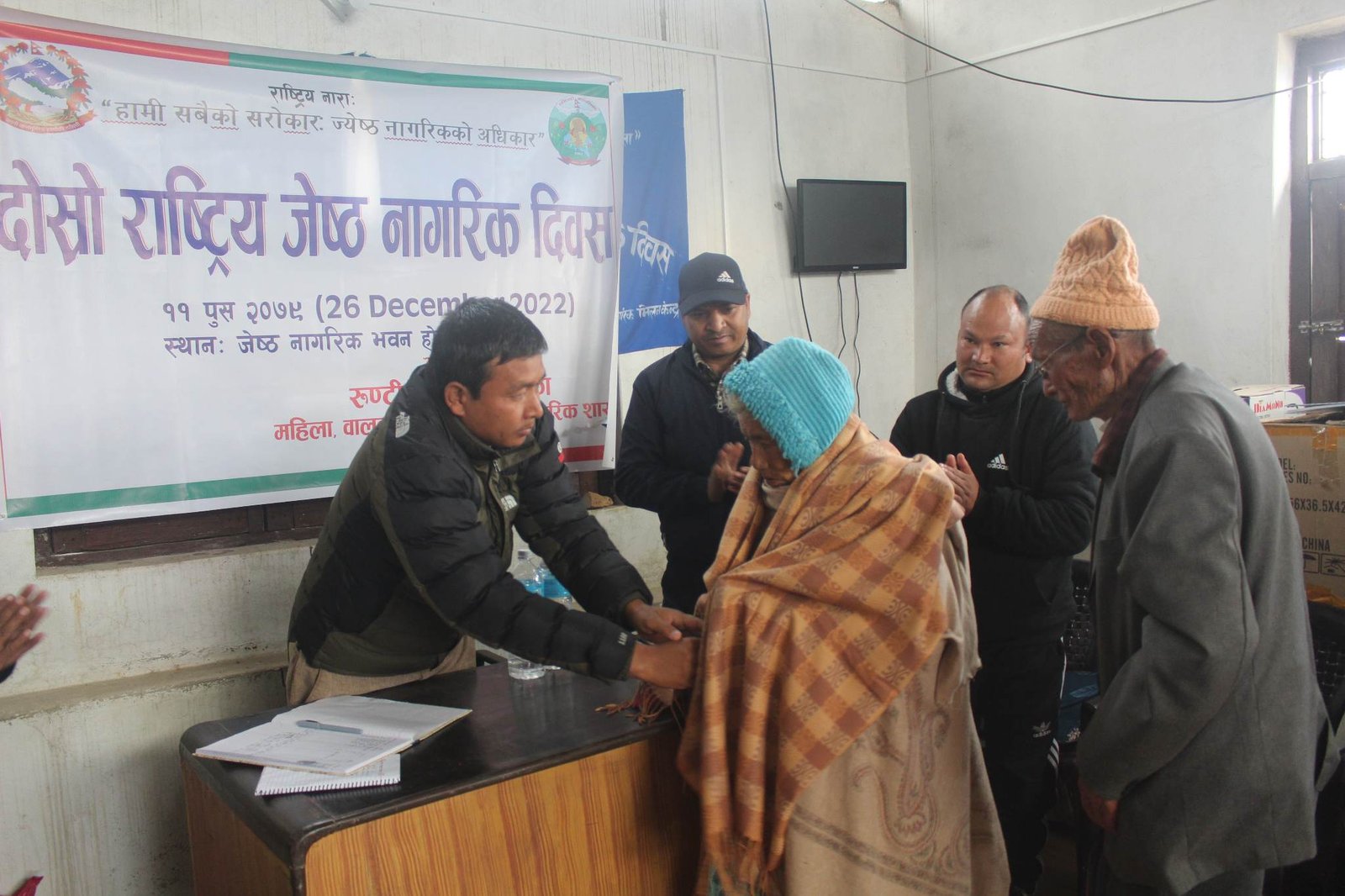 २०५१ साल पुस ११ गते जेष्ठ नागरिकलाई सामाजिक सुरक्षा भत्ता वितरण गरिएको दिनलाई स्मरण गर्दै पोहोर देखि राष्ट्रिय जेष्ट नागरिक दिवस मनाउन सुरु गरिएको हो । दिवसको अवसर पारेर दुई जेष्ठ नागरिकहरुलाई खादा ओदाएर सम्मान गरिएको छ ।
