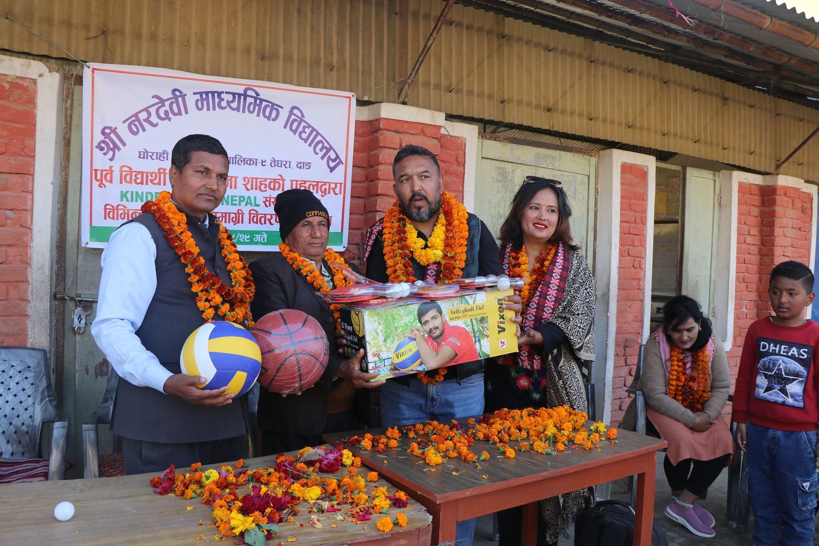 कार्यक्रममा किन्डर हिल नेपालका अनुपबिक्रम शाहाले नेपालका बिभिन्न बिद्यालयहरुमा सहयोग गर्ने क्रममा आज घोराही ९ मा रहेको नरदेबि माबि तेघरामा यसखालको सहयोग हस्तान्तरण गरिएको र यसबाट बिद्यार्थीहरुको अतिरिक्त क्रियाकलापको बिकासमा टेवा पुग्ने बताउनु भयो ।