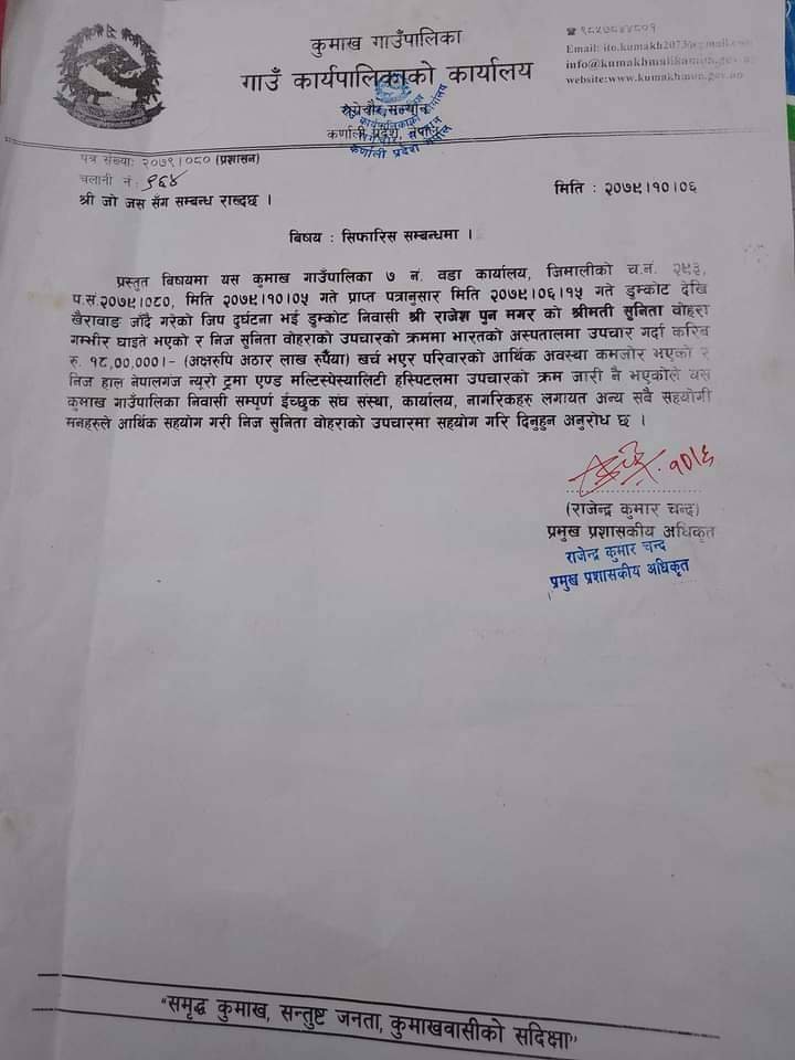 सल्यान, १७ माघ । सल्यानको कुमाख गाउँपालिका वडा न. ७ बस्ने २३ वर्षीय सुनिता बोहरा पुनको गत असोज १५ गते जिल्लाको डुमकोटदेखि खैराबाङ जाँदै गरेको जिप दुर्घटनामा परि टाउकोमा गहिरो चोट लागेर गम्भीर घाइते भएको र उनलाई उपचारको लागि भारतको लखनउ लिएको र उनको परिवारसंग भएको पैसा सबै सकिएर अस्पतालको बिल तिर्न पनि गारो भएर हाल उनी बाकेको नेपालगन्ज न्युरो अस्पतालमा उपचाररत रहेको तर उनको पारिवारिक अबस्थामा हाल निकै नाजुक भैसकेकोले सहयोगको लागि सबैसंग उनको परिवारले अपिल गरेको छ ।