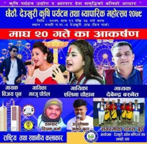१९ माघ, देउखुरी। “कृषि पर्यटन उद्योग र व्यापार, देश समृद्धिको बलियो आधार” भन्ने मुल नाराका साथ देउखुरीको लमहीकाे अजम्बरी सामुदायिक वनको पिकनिक स्थल (बिबिधता पार्क) मा जारी छैंठौ देउखुरी कृषि पर्यटक तथा व्यापारिक महोत्सवको आज आठौं दिन विहिबार पशुपति शर्माको गीतमा उपस्थित दर्शकहरु नाच्न थालेपछी महोत्सवमा चहलपहल बढेको थियो।