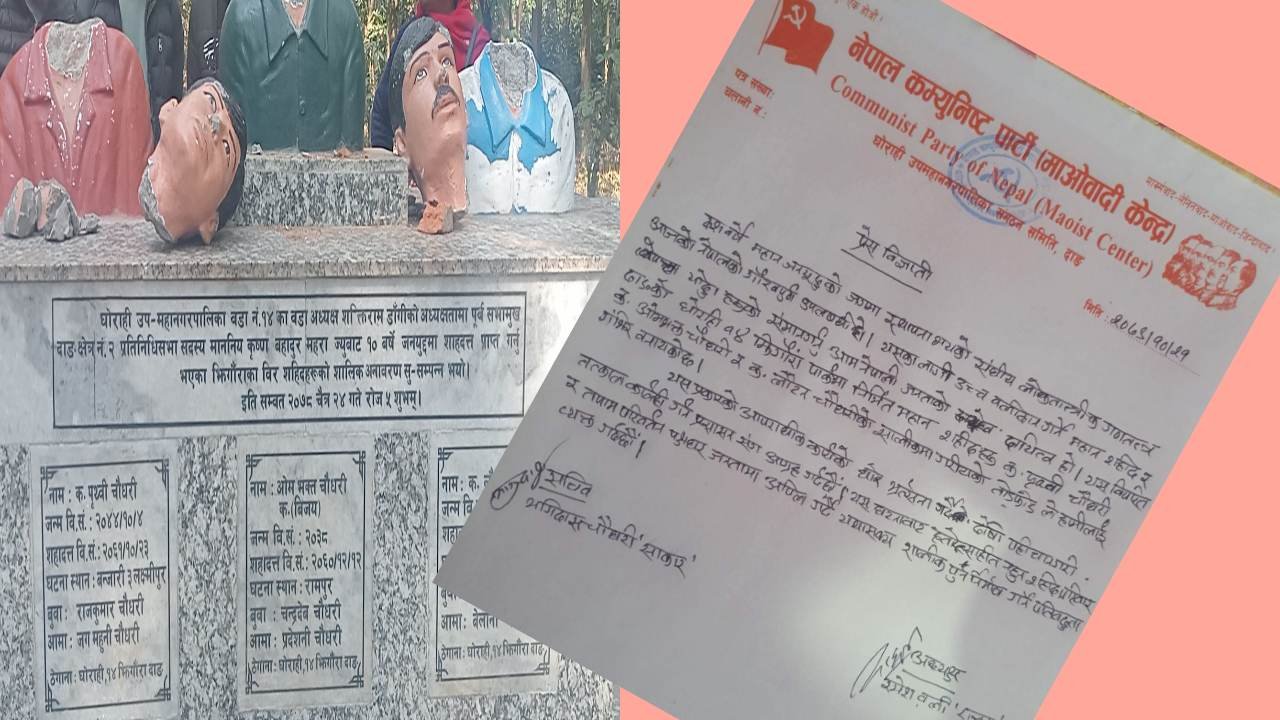 नेकपा (माओवादी केन्द्र) घोराही उपमहानगरपालिका समितिका अध्यक्ष रमेश वली र सचिव भगिदास चौधरीले जारी गरेको विज्ञप्तिमा भनिएको छ –‘घोराही– १४ झिंगौरा पार्कमा निर्मित महान सहिदहरु पृथ्वी चौधरी, ओमभक्त चौधरी र लौटन चौधरीको सालिकमा गरिएको तोडफोडले हामीलाई गम्भीर बनाएको छ । यस प्रकारको अपराधिक कार्यको घोर भ्रत्र्सना गर्दै दोषी पहिचान गरी तत्काल कारबाही गर्न प्रशासनसँग आग्रह गर्दछौं ।’