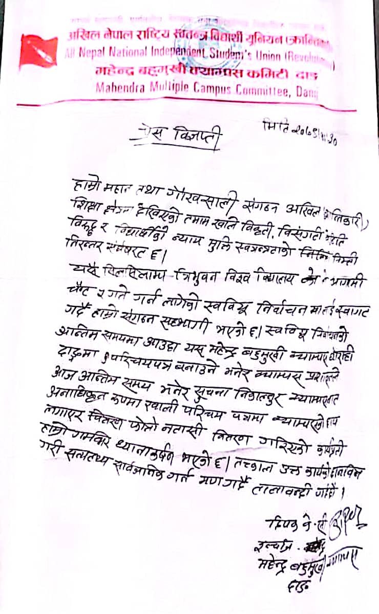 यस्तो छ, अखिल (क्रान्तिकारी) महेन्द्र बहुमुखी क्याम्पस दाङका इन्चार्ज दीपक केसीले जारी गरेको प्रेस विज्ञप्ति :