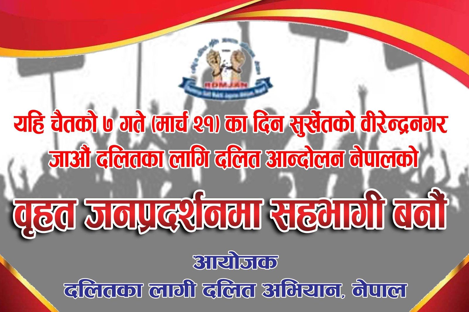 दलितका लागि दलित आन्दोलन भन्ने मूलनाराका साथ अन्तराष्ट्रिय जातीय विभेद उन्मुलन दिवस यही चैत ७ गतेका दिन सुर्खेतको विरेन्द्रनगरमा भव्य रुपमा मनाउने दलित अभियानका सदस्य सुशिल परियारले जानकारी दिए ।