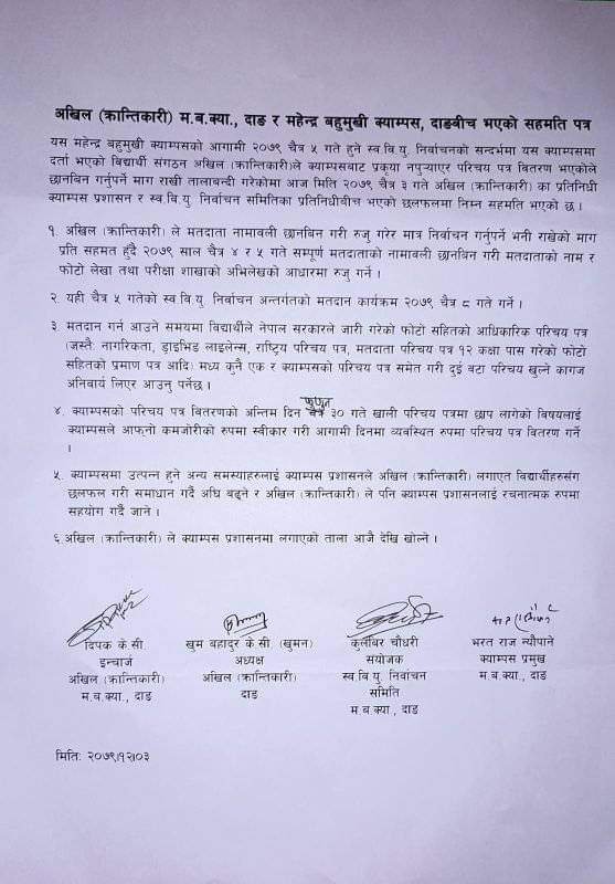 अखिल (क्रान्तिकारी) महेन्द्र बहुमुखी क्याम्पस र महेन्द्र बहुमुखी क्याम्पस दाङबीच आज शुक्रबार भएको छलफलले ६ बुँदे सहमति गर्दै चैत ५ गते हुने स्ववियु निर्वाचनलाई यही चैत ८ गतेका लागि सारेको हो ।
