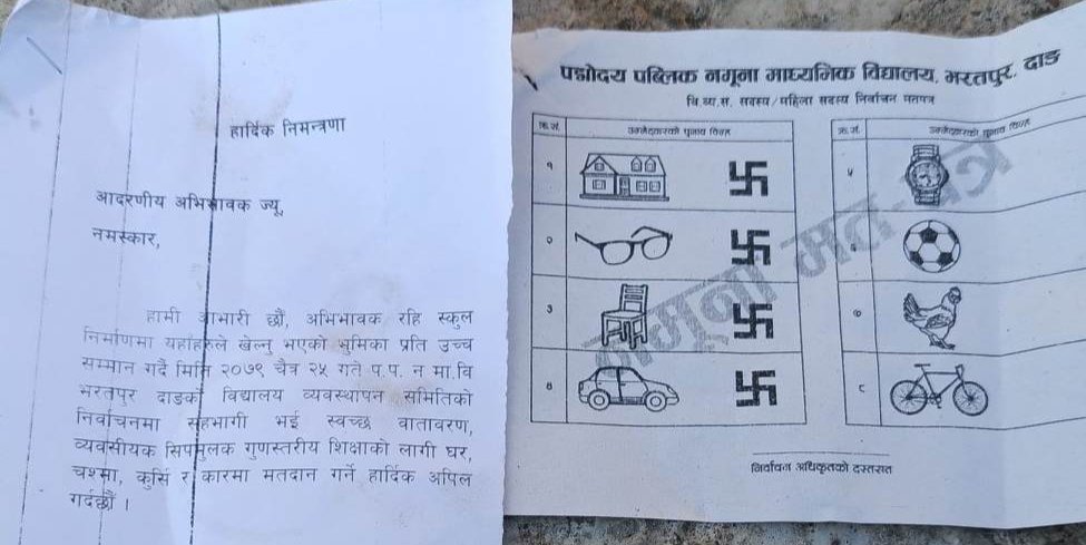 घोराही, २४ चैत । दाङकै जेठो विद्यालय पद्मोदय पब्लिक माध्यमिक विद्यालय भरतपुरको भोलि हुदै गरेको विद्यालय व्यवस्थापन समितिको निर्वाचनमा संयुक्त समूहका उम्मेदवारहरुले आफूहरुलाई मतदान गर्न अभिभावकहरुलाई आग्रह गर्नुभएको छ।