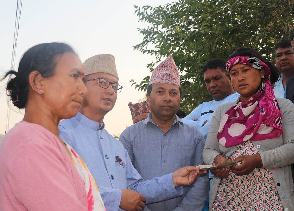 आगलागीबाट विस्थापित परिवारलाई नगद १० हजार रुपैया सहित चामल, नुन, तेल , दाल, भाडाकुडा , बल्याङकेट र त्रिपाल प्रदान गरेको जनाएको छ । राहत सामग्री गाउँपालिकाका अध्यक्ष प्रकाश विष्ट,उपाध्यक्ष कमलापति चाैधरी,प्रमुख प्रशासकीय अधिकृत नेब बहादुर ओली,नेपाल रेडक्रस साेसाईटी उपशाखा लालमटियाका सभापति किरण भण्डारी र सचिव हरि प्रसाद भुसाल तत्कालै पीडितकाे घरैमा पुगेर प्रदान गर्नु भएको हाे।