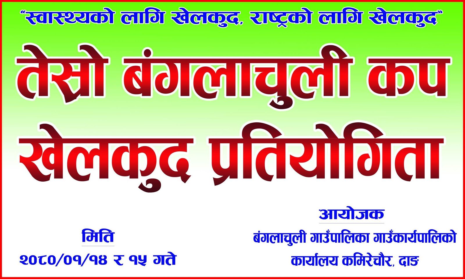 उक्त प्रतियोगिता बिहीबार ठिक ११ बजे बंगलाचुली गाउँपाकिकाको प्राङ्गणमा सूचना तथा सन्चार मन्त्री रेखा शर्माले उद्घाटन गर्ने कार्यक्रम रहेको बंगलाचुली गाउँपालिका अध्यक्ष तुल्सीराम पुनले सिस्ने अनलाइन जानकारी दिनुभएको छ ।