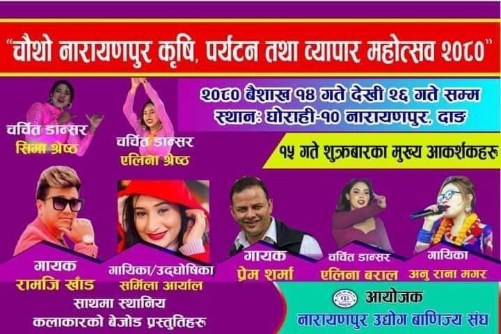 घोराही / नारायणपुर उद्याेग वाणिज्य संघकाे आयाेजनामा सञ्चालन `चाैथाे चाैथाे नारायणपुर कृषि, पर्यटन तथा व्यापार महाेत्सव २०८०´ बिहीबारदेखि सुरु भएको छ ।