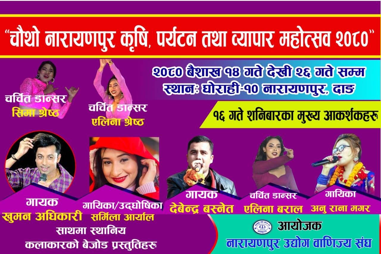 दाङ, १६ वैशाख ।नारायणपुर उद्योग वाणिज्य संघको आयोजनामा वैशाख १४ गतेदेखि २६ गतेसम्म ‘चौथो नारायणपुर कृषि, पर्यटन तथा व्यापार महोत्सव–२०८०’ को तेस्रो दिन आज लोकप्रिय गायक खुमन अधिकारी आउने भएका छन् । अधिकारी नेपाली लोक दोहोरी क्षेत्रका हस्ती नै मानिन्छन् । महोत्सवको तेस्रो दिन आज गायक अधिकारीले आफ्नो प्रस्तुति पस्कने छन् ।
