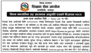 दाङ । शिक्षक सेवा आयोगले निम्न माध्यमिक तहको अध्यापन अनुमति पत्र (लाइसेन्स) को विज्ञापन खुलाएको छ ।