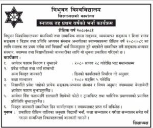 मानविकी तथा सामाजिक शास्त्र सङ्काय, व्यवस्थापन सङ्काय र विज्ञान तथा प्रविधि अध्ययन संस्थान अन्तर्गतका क्याम्पसहरूमा वार्षिक प्रणालीअनुसार शैक्षिक वर्ष ०८०–०८१ को लागि स्नातक प्रथम वर्षमा नयाँ भर्ना खुला गरेको हो ।