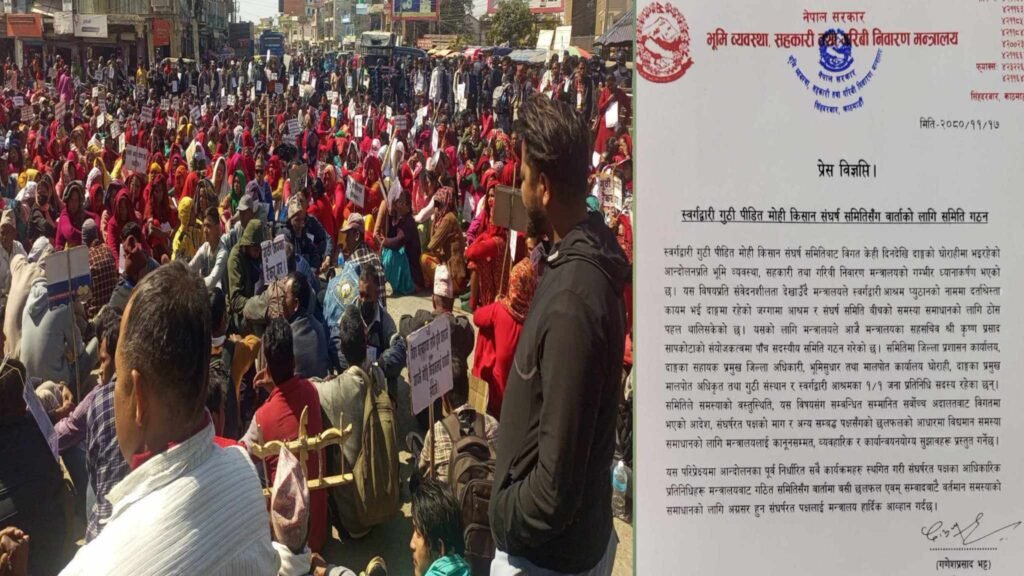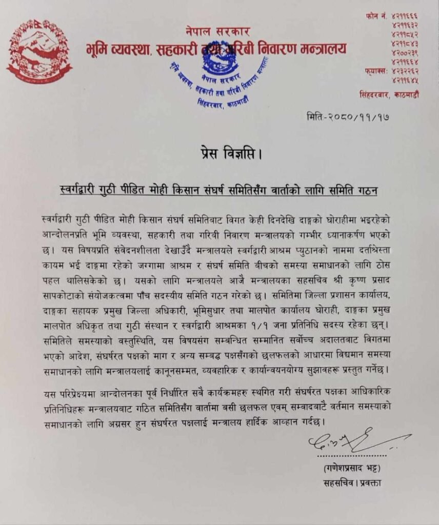 दाङ । स्वर्गद्वारी गुठीपीडित मोही किसान संघर्ष समितिबाट विगत केही दिनदेखि दाङको घोराहीमा भइरहेको आन्दोलनप्रति भूमि व्यवस्था, सहकारी तथा गरिवी निवारण मन्त्रालयको गम्भीर ध्यानाकर्षण भएको छ।