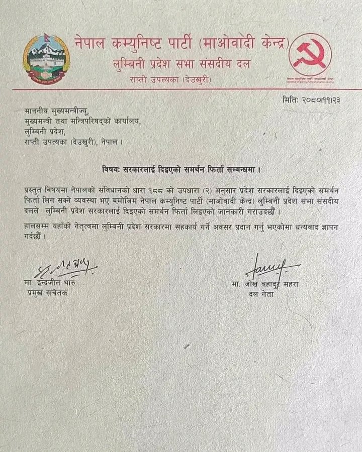 नेकपा माओवादी केन्द्र लुम्बिनी प्रदेशसभा संसदीय दलले आज बुधबार संसद सचिवालयलाई पत्र लेखेर सरकारलाई दिएकाे समर्थन फिर्ता लिएकाे हाे ।