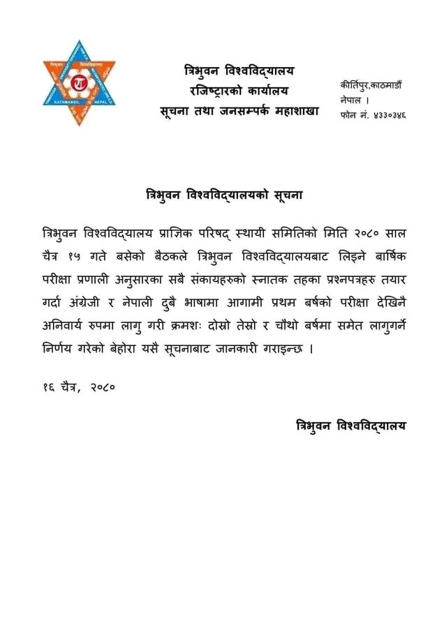 त्रिविले शुक्रबार जारी गरेको सूचनामा भनिएको छ- ‘त्रिभुवन विश्वविद्यालय प्राज्ञिक परिषद् स्थायी समितिको मिति २०८० साल चैत्र १५ गते बसेको बैठकले त्रिभुवन विश्वविद्यालयबाट लिइने वार्षिक परीक्षा प्रणाली अनुसारका सबै सङ्कायहरूको स्नातक तहका प्रश्नपत्रहरु तयार गर्दा अङ्ग्रेजी र नेपाली दुवै भाषामा आगामी प्रथम वर्षको परीक्षा देखिनै अनिवार्य रूपमा लागु गरी क्रमशः दोस्रो तेस्रो र चौथो वर्षमा समेत लागुगर्ने निर्णय गरेको बेहोरा यसै सूचनाबाट जानकारी गराइन्छ ।’