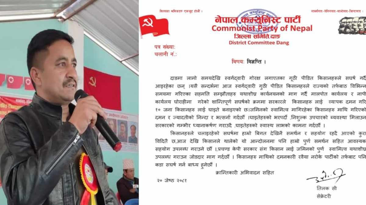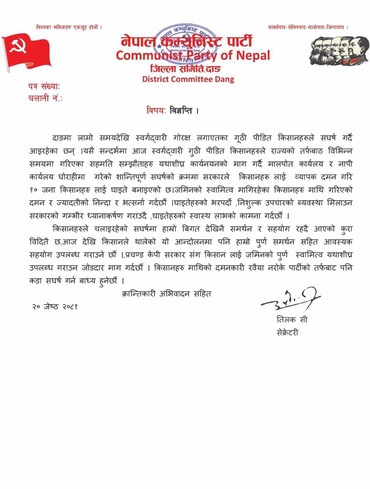 पार्टीका जिल्ला सेक्रेटरी तिलक सीद्वारा हस्ताक्षरित बिज्ञप्तीमा स्वर्गद्वारी गोरक्ष लगाएत गुठी पिडित किसानहरुले राज्यको तर्फबाट गरिएका विभिन्न सहमति सम्झौताहरु यथासिघ्र कार्यान्वयनको माग गर्दै मालपोत कार्यालय र नापी कार्यालय घोराहीमा शान्तिपुर्ण संघर्षको क्रममा १० जना किसानहरुलाइ घाइते बनाएको घटनाको गम्भीर ध्यानाकर्षण भएको जनाइएको छ ।