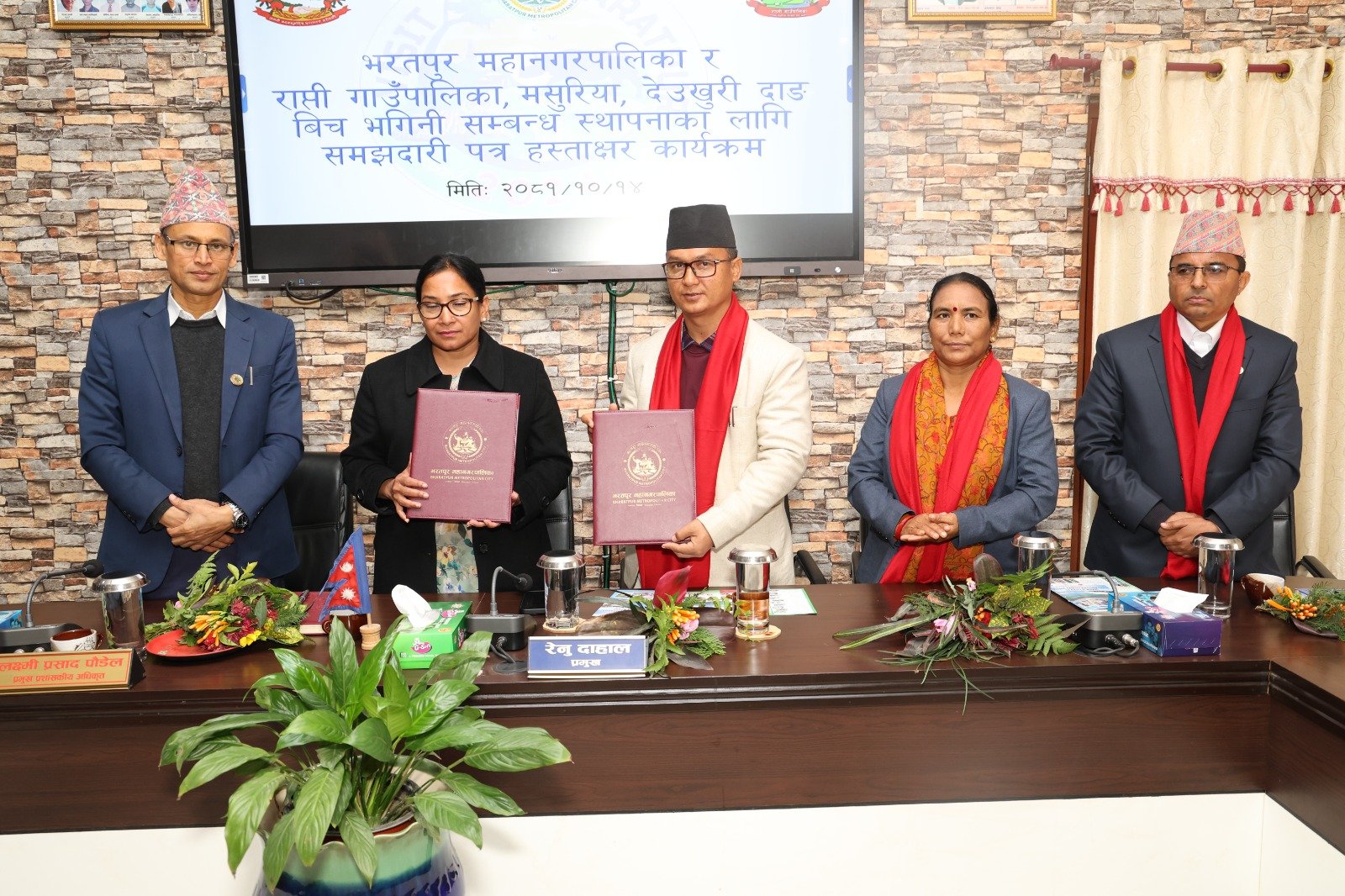 भरतपुर महानगरपालिकाका प्रमुख रेणु दाहाल र राप्ती गाउँपालिकाका अध्यक्ष प्रकाश विष्टले साेमबार भगिनी सम्बन्ध कायम सम्बन्धी समझदारी पत्रमा हस्ताक्षर गर्नुभएको हो ।