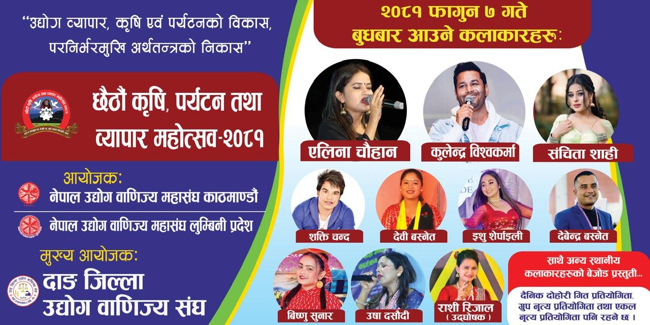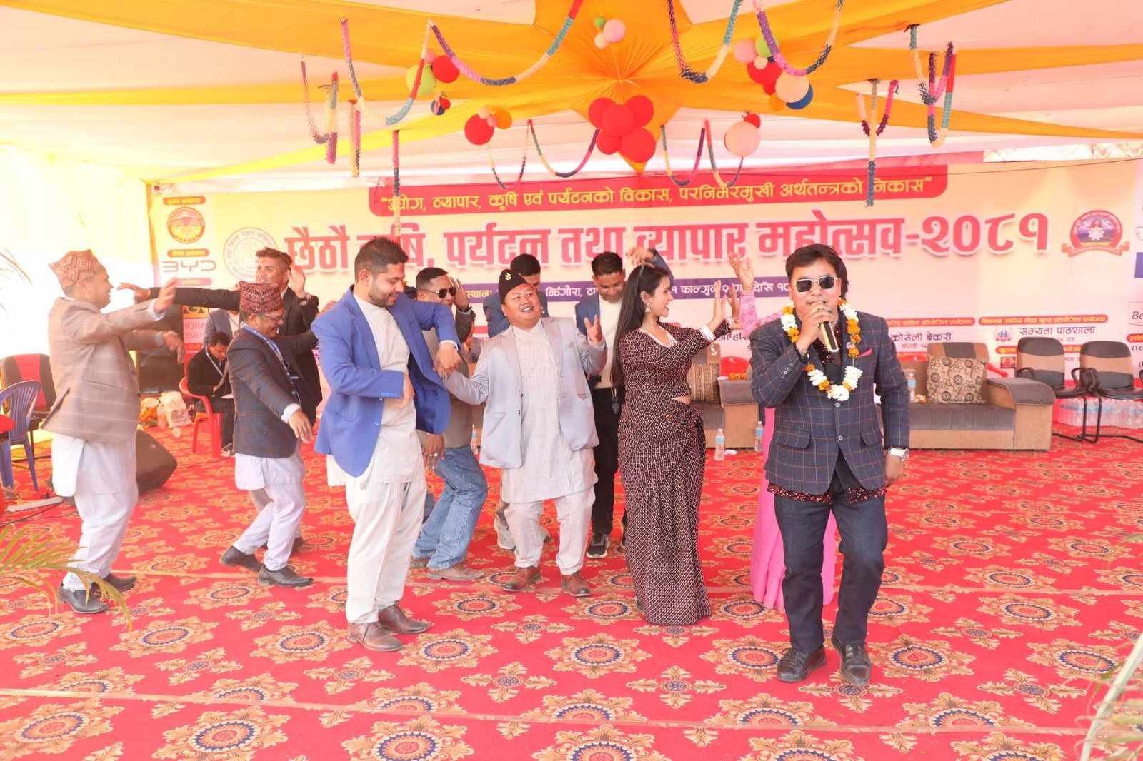 दाङ । ‘उद्योग व्यापार कृषि एवं पर्यटनको विकास, परनिर्भरमुखि अर्थतन्त्रको निकास’ भन्ने मूल नारासहित दाङ जिल्ला उद्योग वाणिज्य संघद्वारा आयोजित ‘छैठौँ कृषि, पर्यटन तथा व्यापार महोत्सव–२०८१’ मा मंगलबार लोकदोहोरी क्षेत्रका चर्चित गायकहरूले आफ्नो प्रस्तुति दिएका छन्।