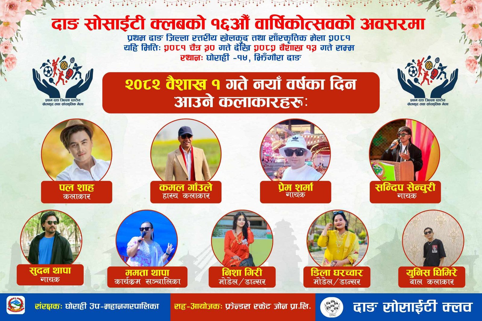 ‘खेलकुद र संस्कृति दाङको पहिचान, स्वरोजगारको आधार’ भन्ने नारासहित क्लबको १६औं वार्षिकोत्सवको अवसरमा आयोजना गरिएको मेला घोराही उपमहानगरपालिका–१४ स्थित झिगौंरामा वैशाख १३ गतेसम्म सञ्चालन हुनेछ।
