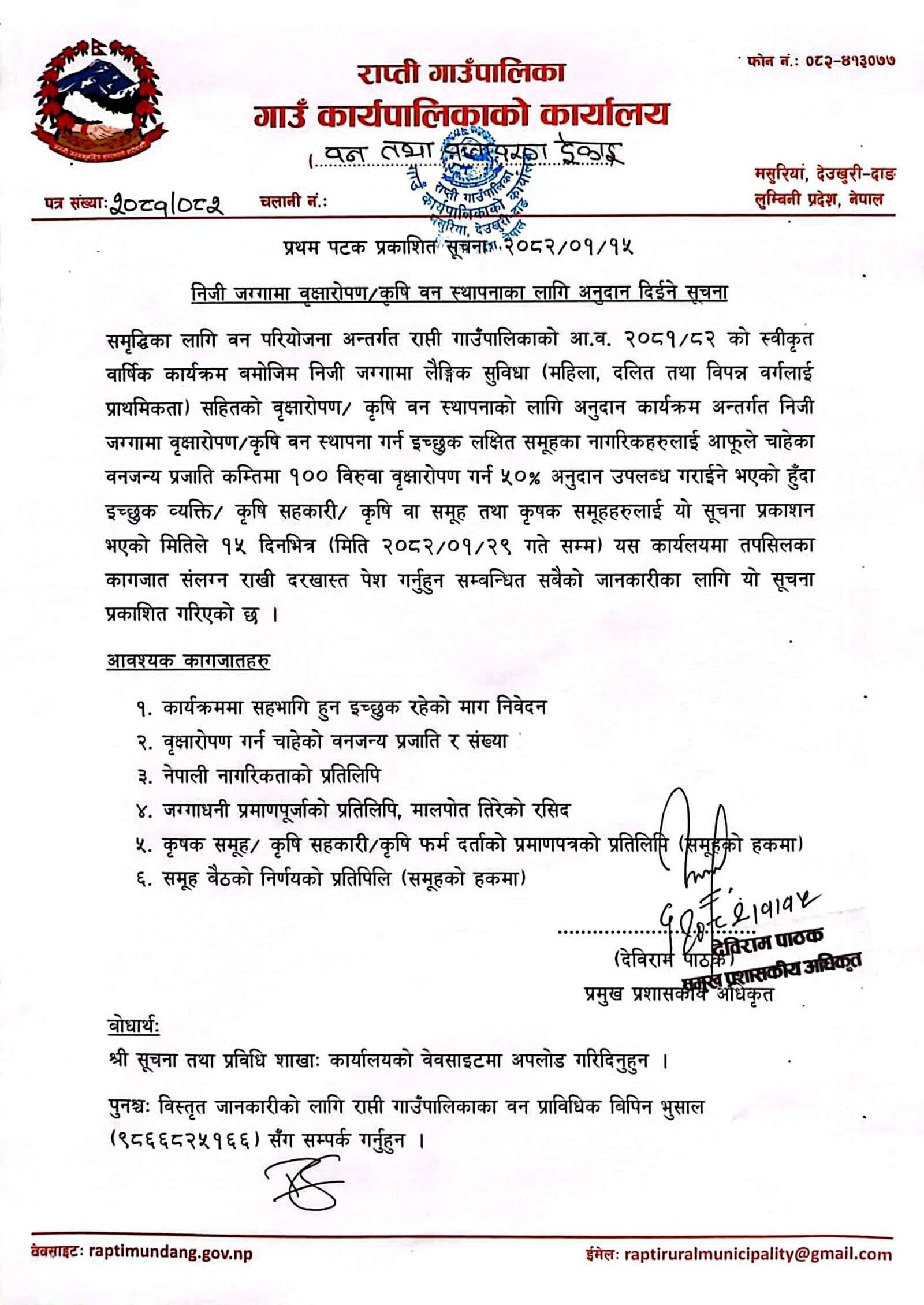 गाउँपालिकाले जारी गरेको सूचनाअनुसार कार्यक्रममा सहभागी हुन चाहनेहरूले कार्यक्रममा सहभागि हुन इच्छुक रहेको माग निवेदन,वृक्षारोपण गर्न चाहेको वनजन्य प्रजाति र संख्या, नेपाली नागरिकताको प्रतिलिपि,जग्गाधनी प्रमाणपूर्जाको प्रतिलिपि, मालपोत तिरेको रसिद, कृषक समूह/ कृषि सहकारी/कृषि फर्म दर्ताको प्रमाणपत्रको प्रतिलिपि,समूह बैठको निर्णयको प्रतिपिलि (समूहको हकमा)विवरणजस्ता आवश्यक कागजातसहित आवेदन दिनुपर्नेछ।