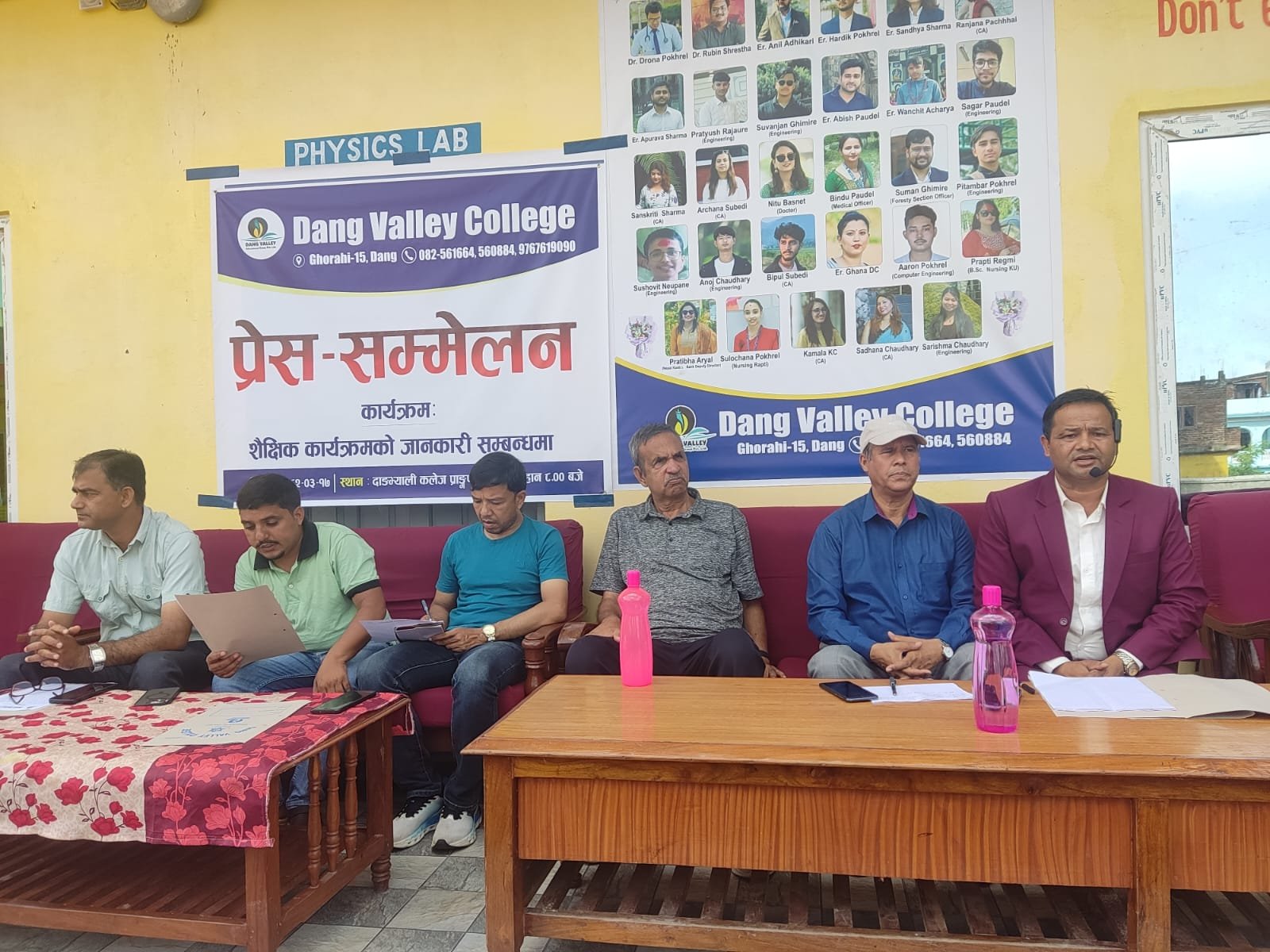 दाङ भ्याली एजुकेसनल ग्रुप प्रालिका अध्यक्ष अरुण अर्यालको अध्यक्षतामा भएको पत्रकार सम्मेलनमा कलेजका प्रिन्सिपल विष्णु बञ्जाडेले शैक्षिक कार्यक्रमको बारेमा जानकारी दिँदै यस वर्षदेखि कलेजमा पत्रकारिता, सिए फाउन्डेसन र होटल म्यानेजमेन्ट सञ्चालनको तयारी थालेको बताउनुभयो । यी विषयहरुको समावेशले विद्यार्थीहरुलाई सीपमूलक, पेशामुखी र व्यवहारिक ज्ञान प्रदा गर्ने मद्दत पुग्ने समेत उहाँको जोड थियो । `२०५७ सालमा स्थापना भएको यस कलेजमा हालसम्म प्लसटुतर्फ विज्ञान, व्यवस्थापन, शिक्षा र मानविकी संकाय र स्नातक तहमा व्यवस्थापन संकाय अन्तर्गत बिबिएस कार्यक्रम सञ्चालनमा रहेको भन्दै अब कलेजले पत्रकारिता, सिए फाउन्डेसन र होटल म्यानेजमेन्ट कोर्ष सञ्चालनको तयारी अगाडि बढाइएको छ, उहाँले भन्नुभयो।´ साथै कलेजले नवीन सोच र विद्यार्थी केन्द्रित शिक्षा प्रणालीलाई आत्मसात गर्दै यस शैक्षिकसत्रदेखि नै बिहानी सत्रमा विज्ञान समूह अन्तर्गतको पठनपाठन सञ्चालनमा ल्याउन थालेको उहाँले जानकारी दिनुभयो ।