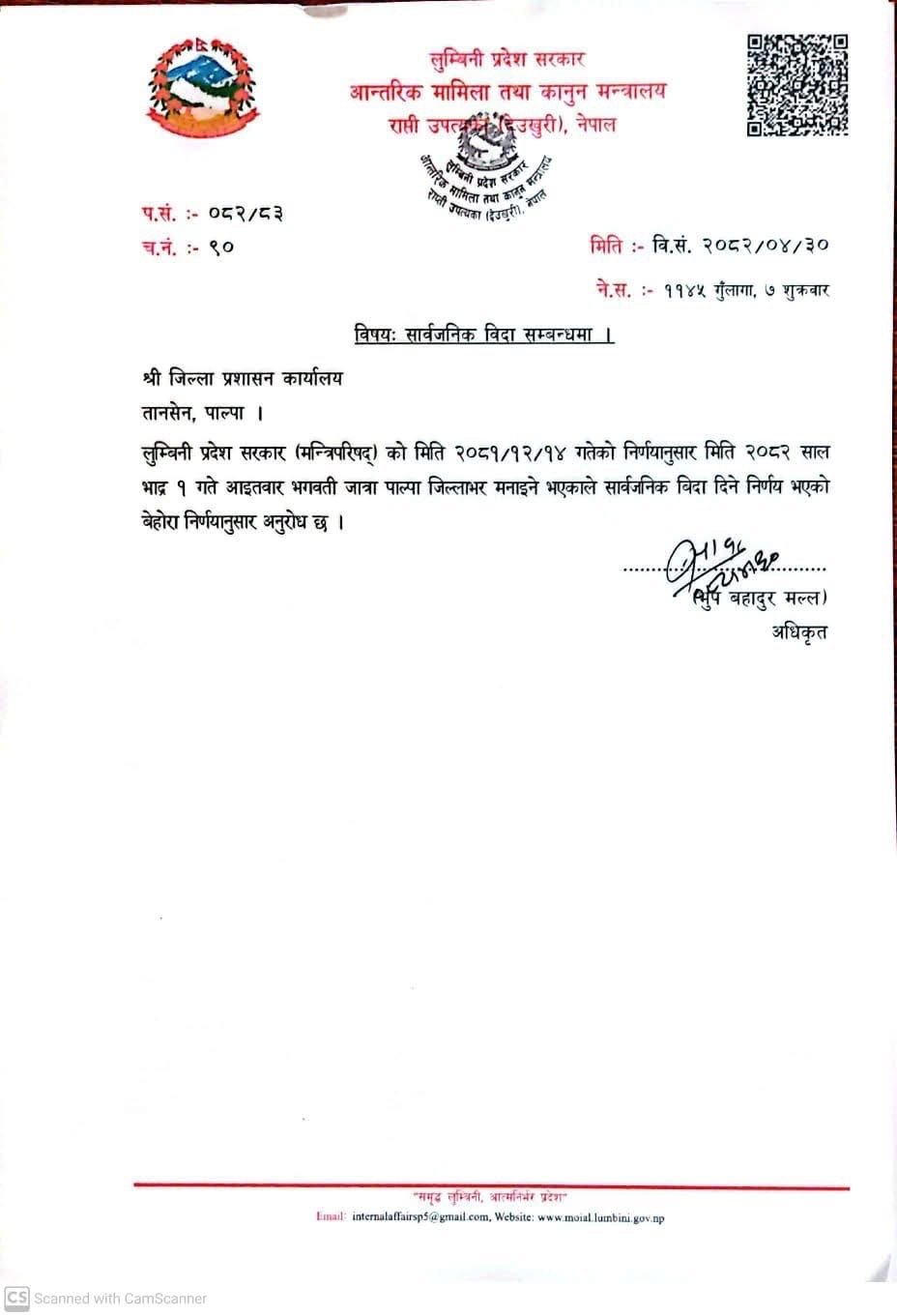 प्रदेश मन्त्रिपरिषद्को २०८१ साल चैत १४ गतेको निर्णय अनुसार सो दिन पाल्पामा भगवती जात्रा मनाइने भएकाले विदा दिने निर्णय गरिएको हाे । नेपाल र इस्ट इन्डिया कम्पनीबीच वि.सं. १८७१-७२ मा भएको युद्धमा नेपाली सेनाले प्राप्त गरेको ऐतिहासिक विजयको स्मरणमा प्रत्येक वर्ष भाद्र कृष्ण नवमीका दिन भव्य रूपमा भगवती जात्रा मनाउनेगरिएको छ ।