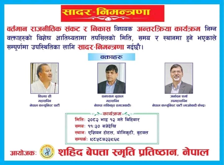 उनीहरूलाई एउटै मञ्चमा जुटाउने कार्य सहिद बेपत्ता स्मृति प्रतिष्ठानले गर्न लागेको हो। प्रतिष्ठानले तीन नेतालाई एकै मञ्चमा राखेर बिहीबार बुटवलस्थित एसियन होटेलमा अन्तरक्रिया गर्न लागेको हो।