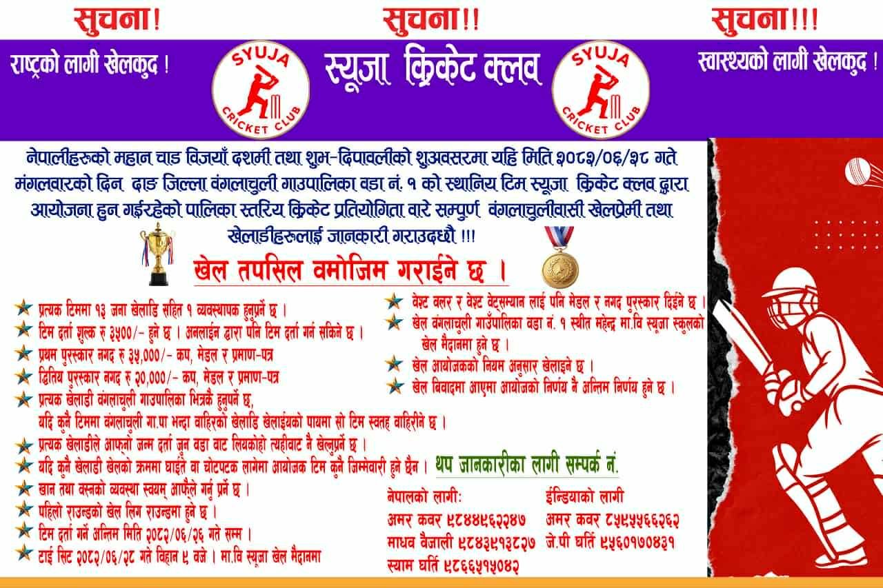 दाङ । बंगलाचुली गाउँपालिका–१ मा रहेको स्युजा क्रिकेट क्लबको आयोजनामा यस वर्षको विजयादशमी तथा दीपावलीको अवसर पारेर क्रिकेट प्रतियोगिता हुने भएको छ । आगामी असोज २८ गते मंगलबारदेखि प्रतियोगिता सुरु हुने आयोजकले जनाएको छ ।