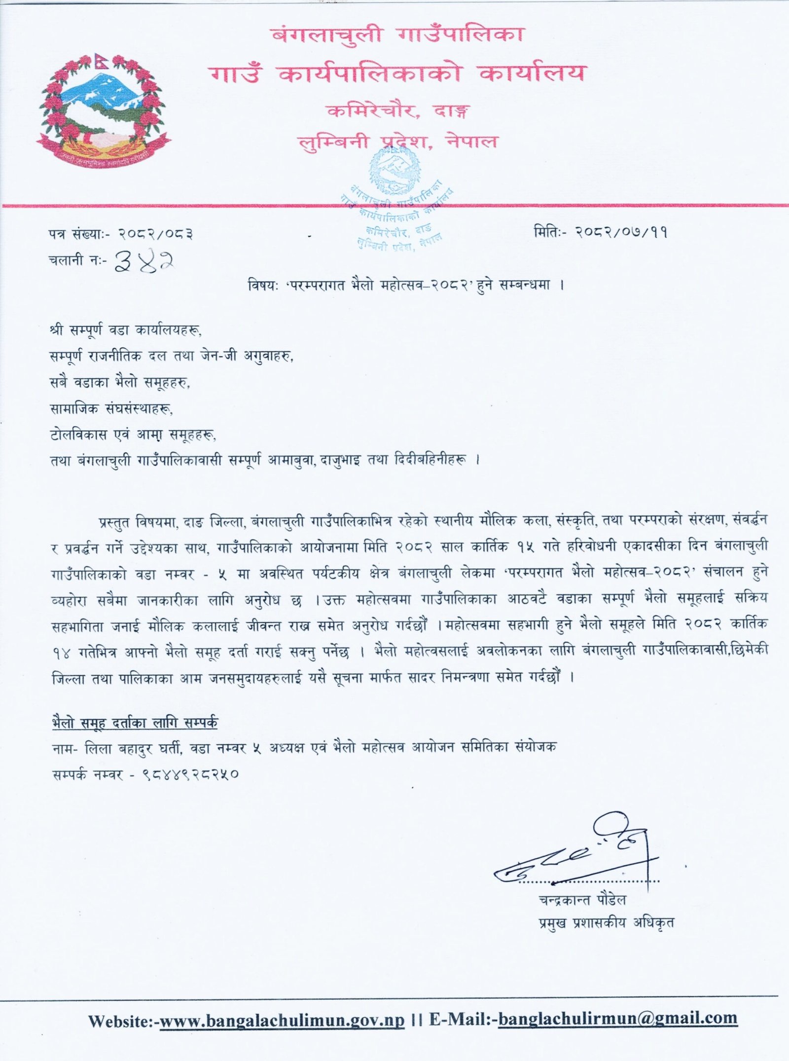 कमिरेचौर । स्थानीय मौलिक कला, संस्कृति र परम्पराको संरक्षण, संवर्द्धन तथा प्रवर्द्धन गर्ने उद्देश्यका साथ बंगलाचुली गाउँपालिकाले यस वर्षपनि भैलो महोत्सव गर्ने भएको छ । गाउँपालिकाले कार्तिक १५ गते (हरिबोधनी एकादशीका दिन) “परम्परागत भैलो महोत्सव–२०८२” गर्ने भएको हो ।