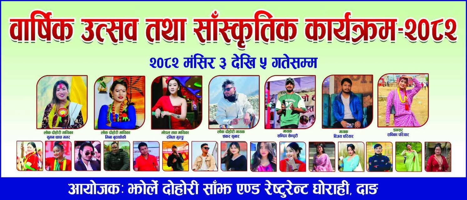दाङ। सांस्कृतिक बिकास र मनोरञ्जनका लागि परिचित बन्दै गएको झोर्ले दोहोरी साँझ एण्ड रेस्टुरेन्ट, घोराहीले आफ्नो प्रथम वार्षिकोत्सवको अवसरमा भव्य र स्मरणीय सांस्कृतिक महोत्सव आयोजना गर्ने भएको छ।