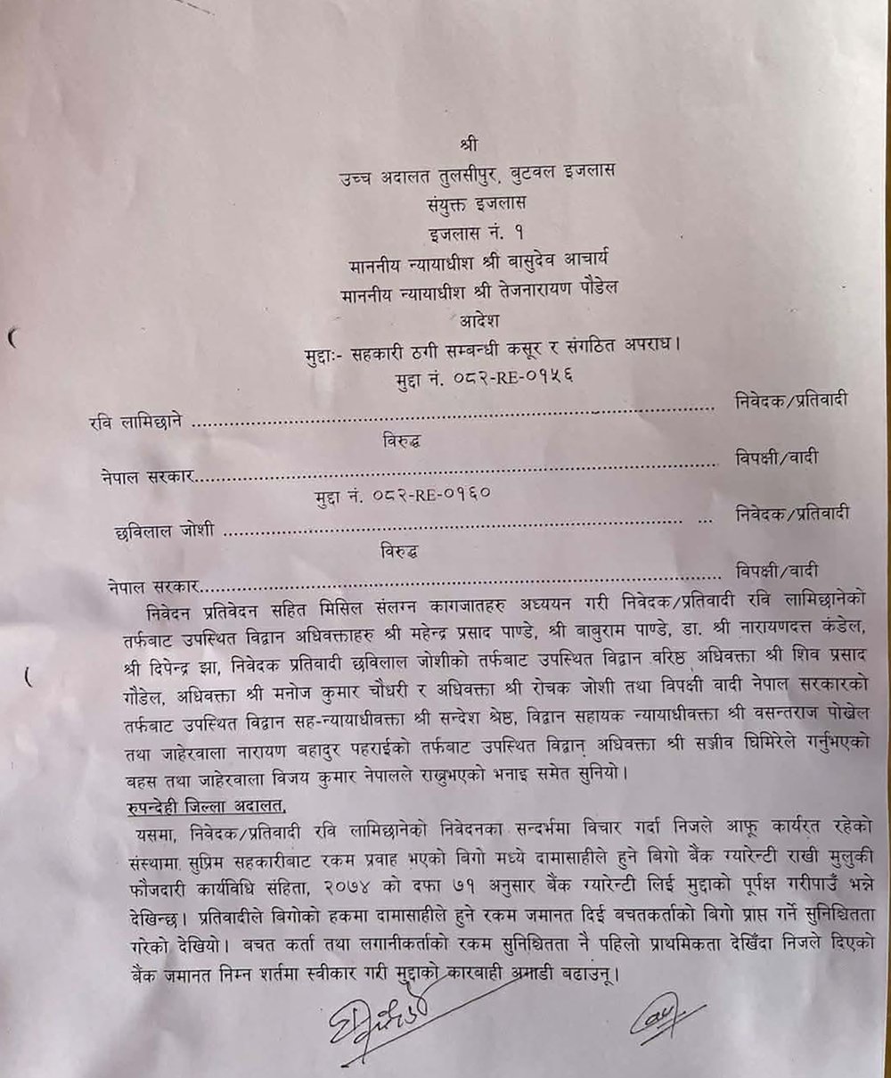 बुटवल । उच्च अदालत तुलसीपुरको बुटवल इजलासले रास्वपा सभापति रवि लामिछानेलाई धरौटीमा रिहा गर्ने आदेश गर्दा पाँच वटा शर्त तोकेको छ । न्यायाधीशद्वय वासुदेव आचार्य र तेजनारायण पौडेलको इजलासले यस्तो शर्त राखेको हो ।