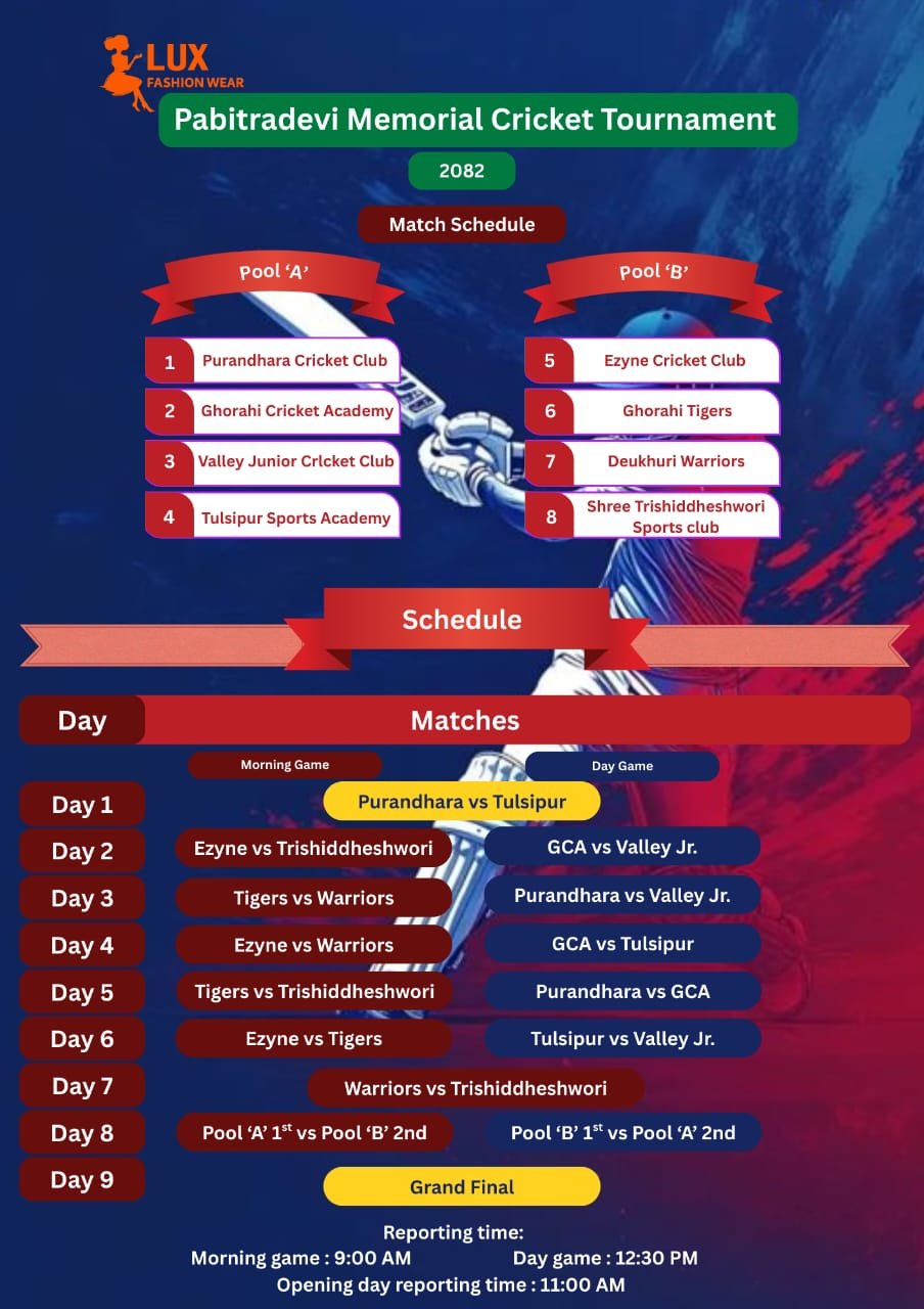 सार्वजनिक खेल तालिकाअनुसार प्रतियोगिताको पहिलो दिन पुरन्धरा च्यालेन्जर्स र तुलसीपुर स्पोर्ट्स एकेडेमीबीच खेल हुनेछ।