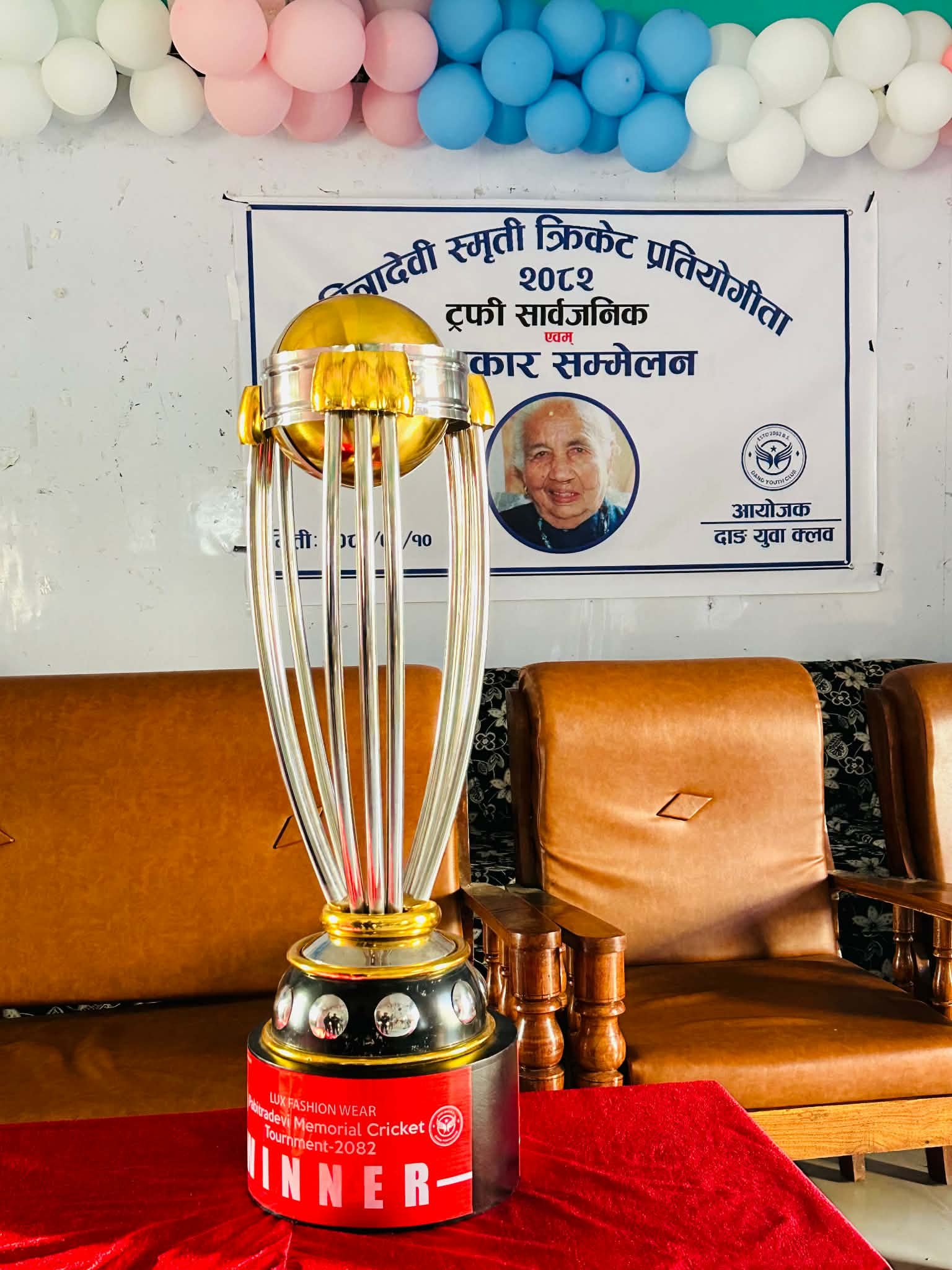 दाङ । दाङ युवा क्लबको आयोजनामा तथा दाङ क्रीकेट संघको प्राविधिक सहयोगमा हुन लागेको पवित्रादेवी स्मृति क्रिकेट प्रतियोगिता–२०८२ को ट्रफी बिहीबार सार्वजनिक गरिएको छ। प्रतियोगिताको मुख्य प्रायोजक लक्स फेशन वेयर रहेको आयोजकले जानकारी दिएको छ।