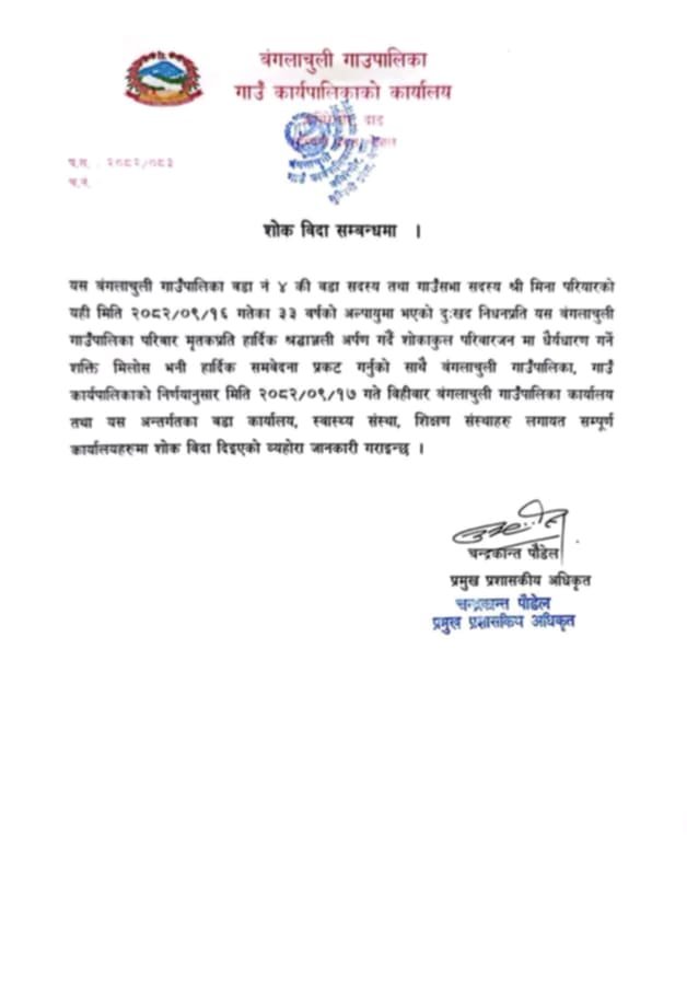गाउँ कार्यपालिकाको निर्णयअनुसार २०८२ साल पुस १७ गते बिहीबार बंगलाचुली गाउँपालिका कार्यालयसहित अन्तर्गतका सबै वडा कार्यालय, स्वास्थ्य संस्था, शिक्षण संस्था लगायत सम्पूर्ण सरकारी कार्यालयहरूमा शोक बिदा दिइएको जानकारी गराइएको छ।