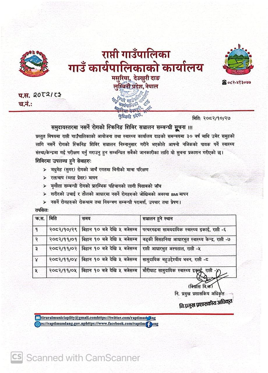 राप्ती गाउँपालिकाको आयोजनामा तथा स्वास्थ्य कार्यालय दाङको समन्वयमा ३० वर्षभन्दा माथिका नागरिकलाई लक्षित गरी उक्त शिविर सञ्चालन गर्न लागिएको हो।